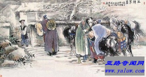 主人公为刘备:刘备拜访茅庐,可恰巧诸葛亮这天出去了,刘备只能失望而归。不久,刘备再次和关羽、张飞冒着大风雪来到卧龙岗,不料诸葛亮又出外闲游去了。张飞本就莽撞,见诸葛亮不在家,就催着要回去。刘备无奈,只得留下一封信,表达了自己对诸葛亮的敬佩以及希望能请他出来帮助自己挽救国家危险局面的意思。