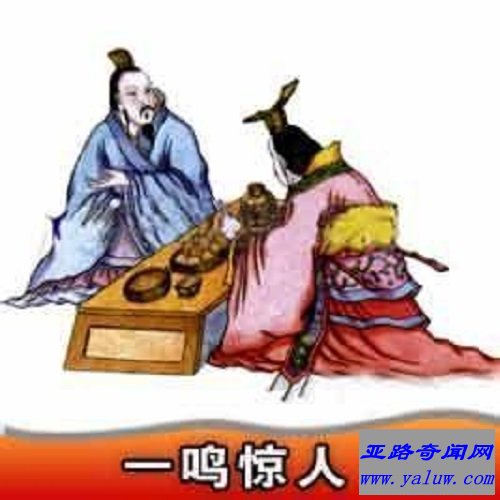一鸣惊人的主人公是谁?让我们分析一下。楚庄王即位近三年以来,他整天打猎、喝酒,不理政事,还在宫门口挂起块大牌子,上边写着:“进谏者,杀毋赦!”这一天,大夫伍举(一说申无畏)进见楚王。楚庄王手中端着酒杯,口中嚼着鹿肉,醉醺醺地在观赏歌舞。他眯着眼睛问道:“大夫来此,是想喝酒呢,还是要看歌舞?”伍举话中有话地说:“有人让我猜一个谜语,我怎么也猜不出,特此来向您请教。”楚庄王一面喝酒,一边问:“什么谜语,这么难猜?你说说。”伍举说:“谜语是‘楚京有大鸟,栖上在朝堂,历时三年整,不鸣亦不翔。令人好难解,到底为哪桩?’您请猜猜,不鸣也不翔。这究竟是只什么鸟?”楚庄王听了,心中明白伍举的意思,笑着说:“我猜着了。它可不是只普通的乌。这只鸟啊,三年不飞,一飞冲天;三年不鸣,一鸣惊人。你等着瞧吧。”伍举明白了楚庄王的意思,便高兴地退了出来。