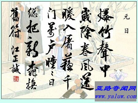 《元日》是北宋政治家王安石创作的一首七言绝句。这首诗描写新年元日热闹、欢乐和万象更新的动人景象,抒发了作者革新政治的思想感情,充满欢快及积极向上的奋发精神。