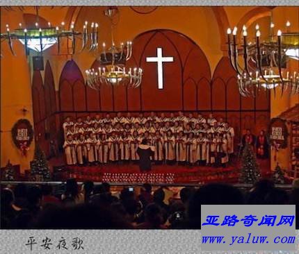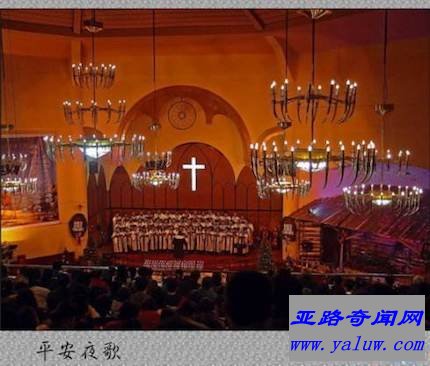 2、平安夜,圣善夜,牧羊人,在旷野,忽然看见了天上光华,听见天军唱哈利路亚;救主今夜降生!救主今夜降生!