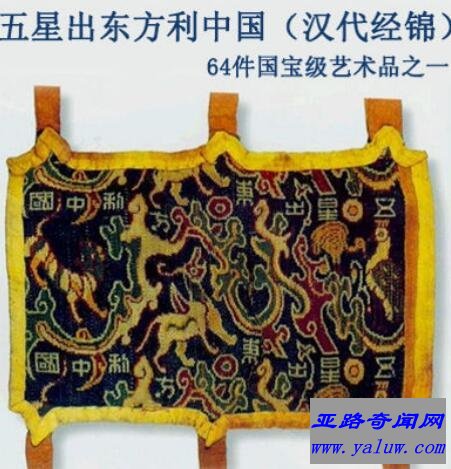 五星出东方利中国,汉代蜀地织锦护臂,为国家一级文物,中国首批禁止出国(境)展览文物。被誉为20世纪中国考古学最伟大的发现之一。1995年10月,中日尼雅遗址学术考察队成员在新疆和田地区民丰县尼雅遗址一处古墓中发现该织锦。收藏于新疆博物馆。该织锦呈圆角长方形,长18.5厘米,宽12.5厘米,用"五星出东方利中国"织锦为面料,边上用白绢镶边,两个长边上各缝缀有3条长约21厘米、宽1.5厘米的白色绢带,其中3条残断。织有八个汉隶文字:"五星出东方利中国。通过"五星聚会"研究,科学家们推算出2040年9月9日将会出现罕见的五星聚会天文奇观。