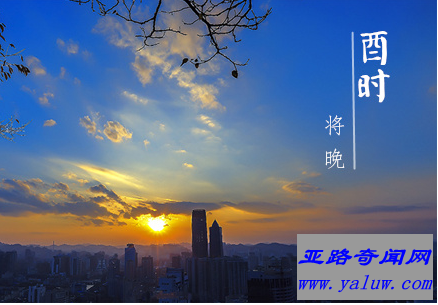 【午时】日中,又名日正、中午等:(北京时间11时至13时)。 【未时】日昳,又名日跌、日央等:太阳偏西为日跌。(北京时间13时至15时)。 【申时】哺时,又名日铺、夕食等:(北京时间15食至17时)。 【酉时】日入,又名日落、日沉、傍晚:意为太阳落山的时候。(北京时间17是至19时)。 【戌时】黄昏,又名日夕、日暮、日晚等:此时太阳已经落山,天将黑未黑。天地昏黄,万物朦胧,故称黄昏。(北京时间19时至21时)。 【亥时】人定,又名定昏等:此时夜色已深,人们也已经停止活动,安歇睡眠了。人定也就是人静。(北京时间21时至23时)。 一个时辰相当于现在2个小时。