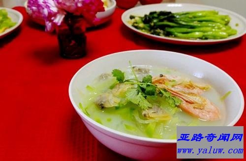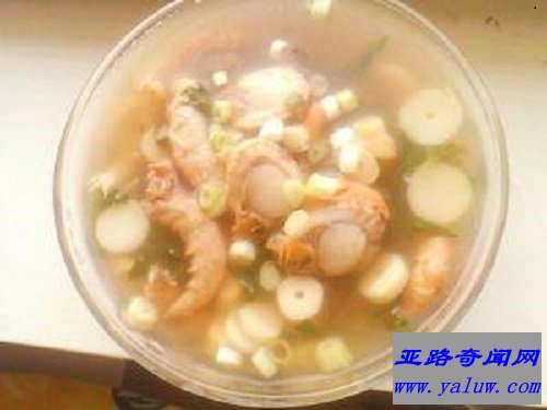 扇贝柱,在各大超市都有卖,可是带边的扇贝肉一般内陆人不会常见。也就是带壳的焗扇贝或者烤扇贝的时候见过,相信很多人都难以将其和大家所常见的扇贝柱联系在一起。这道扇贝汤可是原汁原味的紧呢!从来没做过饭的人,闭眼也会做。” 食材明细 主料 扇贝肉 250g 海虾仁 100g辅料 笋 少许配料 盐、香油、蒜、葱、山菜 少许 扇贝海鲜汤的做法步骤