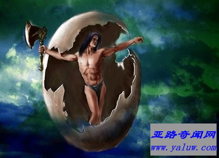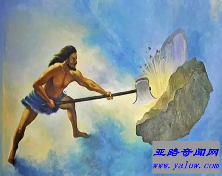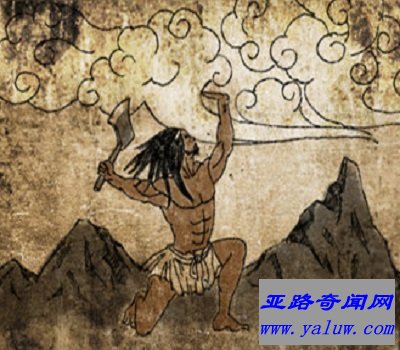 盘古是中国古代传说中开天辟地的神,他殚精竭虑,以自己的生命演化出生机勃勃的大千世界,给后人留下无穷无尽的宝藏,是中华民族崇拜的英雄。据民间神话传说,盘古出生在黑暗团中,他不能忍受黑暗,于是用神斧劈向四方,一股清新的气体散发开来,飘飘扬扬升到高处,变成天空;另外一些浑浊的东西缓缓下沉,变成大地。从此,混沌不分的宇宙变成天和地两部分,不再是漆黑一片。为了防止天和地重新合并,他不断地施展法术。每当盘古的身体长高一尺,天空就随之增高一尺,经过一万八千多年的努力,盘古变成一位顶天立地的巨人,而天空也升得高不可及,大地也变得厚实无比。
