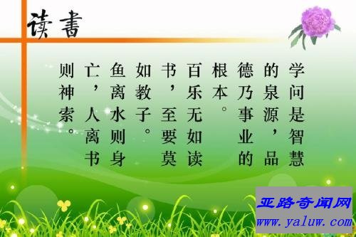 6、如果把生活比喻为创作的意境,那么阅读就像阳光。——池莉7、应做的功课已完而有余暇,大可以看看各样的书,即使和本业毫无相干的,也要泛览。——鲁迅8、只看一个人的着作,结果是不大好的:你就得不到多方面的优点。必须如蜜蜂一样,采过许多花,这才能酿出蜜来,倘若叮在一处,所得就非常有限,枯燥了。——鲁迅9、读书力求三性:韧性、记性、悟性。有韧性没有记性,读了白读;有记性没有悟性,书是死书。三性具备,堪称知识富翁。——魏明伦