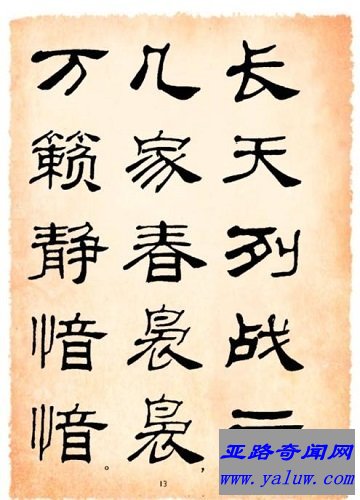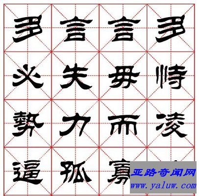 隶书中点画组合表面看较为四散,但形散神聚。点画与点画、部件与部件,或相向、或相背、或相随、或相互吸纳、或相互承受。隶书中的有些字,在我们今天看来,结体是很笨拙的,但细细琢磨,就可看出这是古人打破常规结构,故意夸张某一部分,以达到拙中见巧的意境,使隶书独具风格。