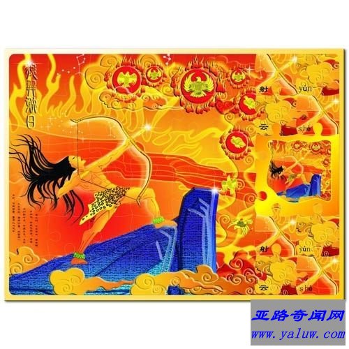 后羿射日的传说出自《山海经》、《书;尧典》、《十州记》、《淮南子》、《天问》等著作,故事内容:远古的时候,大地出现了严重的旱灾。炎热烤焦了森林,烘干了大地,晒干了禾苗草木。原来,帝俊与羲和生了10个孩子都是太阳,他们住在东方海外,海水中有棵大树叫扶桑。10个太阳睡在枝条的底下,轮流跑出来在天空执勤,照耀大地。但有时,他们一齐出来给人类带来了灾难。为了拯救人类,后羿张弓搭箭,向那9个太阳射去。只见天空出现爆裂的火球,坠下一个个三脚的乌鸦。最后,天上只留下一个太阳。