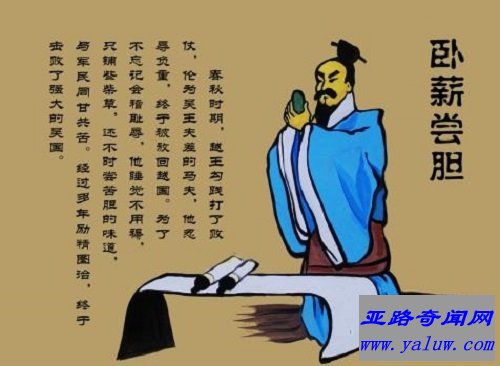 回国以后,越王勾践时刻不忘报仇雪恨。白天,他亲自下田耕种;晚上,就睡在柴草上。他还在屋里挂了一只苦胆,每顿饭前,总是要先尝尝它的苦味,提醒自己时刻不忘兵败会稽的耻辱。经过二十多年的努力,越国终于转弱为强,出奇兵灭掉了吴国。