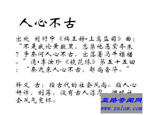 人心不古。古:古代的社会风尚。指今人的心地失淳朴而流于诈伪,没有古人厚道。慨叹社会风气变坏。出自 明 ·张居正 《答两广殷石汀论平古田事》:“近来人心不古,好生异议。”世态炎凉,世态:人情世故;炎:热,亲热;凉:冷淡。指一些人在别人得势时百般奉承,别人失势时就十分冷淡。