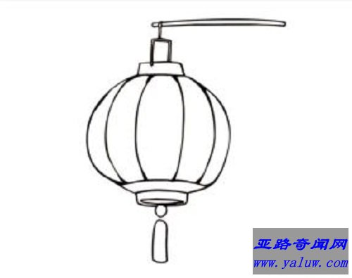 在大椭圆形的中间画一条直线,直线的两个顶点左右分别画出两条弧线,再从底部滴小长方体滴上两点画出两条弧线分割一下灯笼。再来是画灯笼下面的絮,长短可以不一,但是注意倾斜方向要统一。