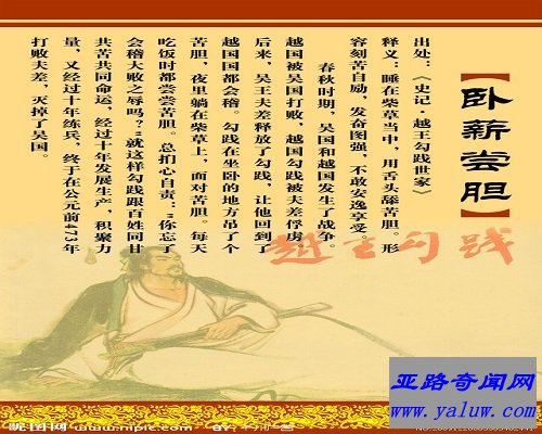 越国被吴国打败,越国勾践被夫差俘虏。后来,吴王夫差释放了勾践,让他回到了越国国都会稽。勾践在坐卧的地方吊了个苦胆,夜里躺在柴草上,面对苦胆。每天吃饭时都尝尝苦胆。总扪心自责:\&;你忘了会稽大败之辱吗?\&;就这样勾践跟同甘共苦共同命运,经过十年发展生产,积聚力量,又经过十年练兵,终于在公元前473年打败夫差,灭掉了吴国。