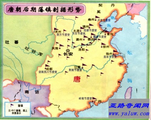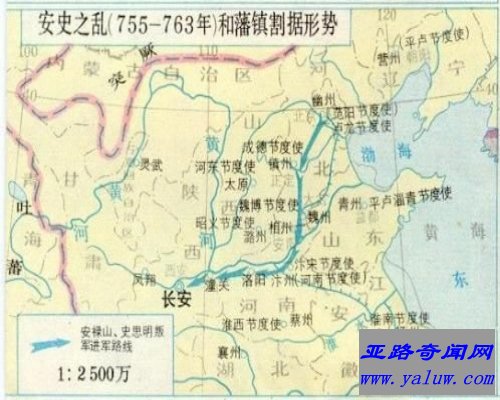 二、藩镇割据。安史之乱,摧毁了统治基础,削弱了封建集权,为封建割据创造了必要条件,使唐王朝自盛而衰,一蹶不振。此后实际上统一的中央王朝对地方的控制力减弱,安史余党在北方形成藩镇割据,各自为政。