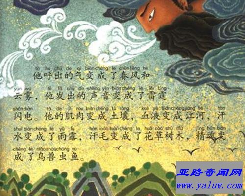 盘古倒下后,他的身体发生了巨大的变化。他呼出的气息,变成了四季的风和飘动的云;他发出的声音,化作了隆隆的雷声。他的双眼变成了太阳和月亮;他的四肢,变成了大地上的东、西、南、北四极;他的肌肤,变成了辽阔的大地,他的血液,变成了奔流不息的江河,他的汗,变成了滋润万物的雨露......