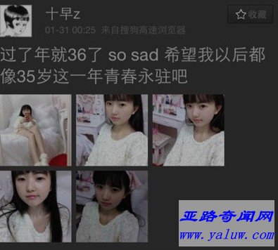 微博内容如下:“过了年就36了,So sad,希望我以后都像35岁一样青春永驻吧。”,并且附上了几张自拍照。自称36岁,而照片中的她却拥有着犹如十几岁的小姑娘一般的模样。这不仅让网友们惊呆了,还给了她一个封号:“天山童姥”。