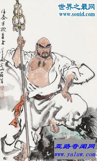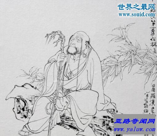 原是第十罗汉的弟弟,他出家后化缘的办法是用拳头拍门叫屋里的人出来布施。佛认为不妥,就赐他一根锡杖。他化缘时,就用锡杖在人家门前摇动,人家听见这声音果然就心生欢喜,开门布施,成道后世人就称他为看门罗汉。这锡杖(也叫禅杖)后来也就成为和尚出门随带的法器。