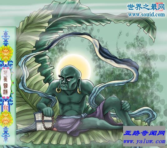 原是古印度恶魔波旬,他大扇动那竭国人四出杀害僧人,尽毁佛殿佛塔,将所有的佛经都劫到那竭国去。龙王用洪水淹没了那竭国,将佛经收藏于龙宫。后来,庆友尊者降服龙王,取回佛经,故也人称他为“降龙罗汉”。
