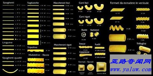 。 作为意大利面的法定原料,杜兰小麦是最硬质的小麦品种,具有高密度、高蛋白质、高筋度等特点,其制成的意大利面通体呈黄色,耐煮、口感好。 意大利面根据种类形状也各不相同,除了中国人认为是面条的的直身粉外还有螺丝型的、弯管型的、蝴蝶型的、空心型,贝壳型的林林总总数百种。