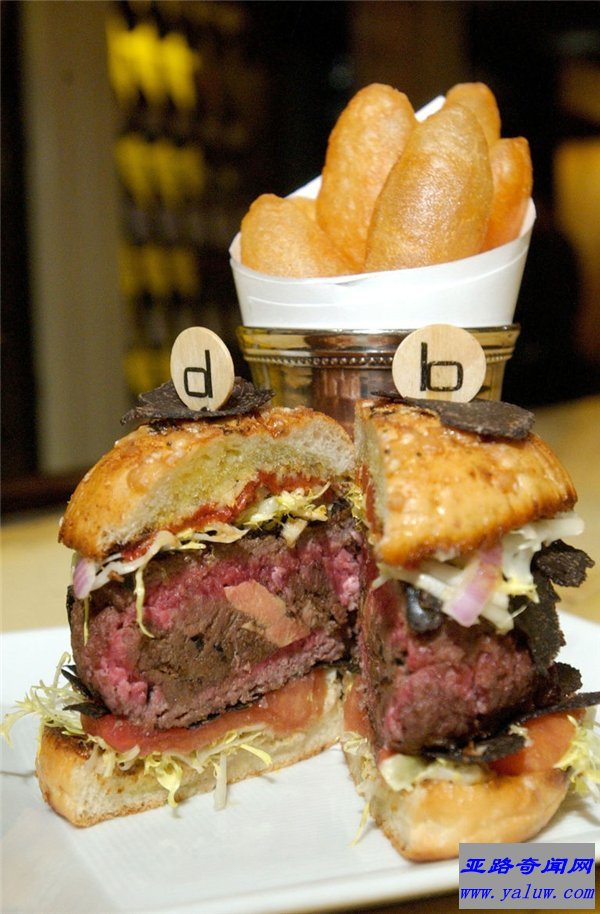 奢侈的食材往往意味着高昂的售价,位于纽约的DB Bistro Moderne非常了解这其中的奥秘。他们推出的松露汉堡,选择了西冷牛排作为原料,肉排中还包裹了足量的鹅肝酱调味。最后,厨师十分大方地在肉饼和汉堡 胚之上,铺上了厚厚的一层松露。唯一让人担心的是:这些奢侈食材组合起来真的好吃吗?