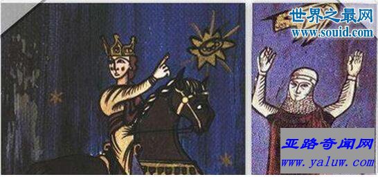 图中描述撒克逊人包围了法国的Sigiburg城,当时在教堂的上空出现一个盘状物体,撒克逊人被这情况吓跑了。仔细看,这么一块光体是什么?反正看起来十分像外星飞船的。也许有的人会觉得像是电灯泡,但这幅画是作于12世纪的,那个时候哪来的电灯啊!